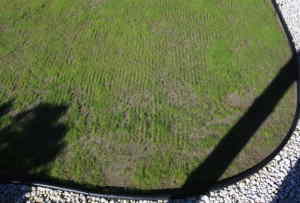 | ・・・・・・・ 2010.10.23 ・・・・・・・ 播種から5週間、35日目です。 先週、肥料不足の中央部に固形肥料(10・10・10)を10g/u追肥しました。 この一週間で何とか周囲の芝に追いつき全面ほぼ均一な緑になりました。 先々週の下手な肥料散布で、想定より一週間遅れです。 |
