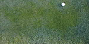 | 夜露の付いている葉と、付いていない葉。 病害は、ブラウンパッチのような明らかな円形ではありません。 ボールは大きさの比較のために置きました。 |