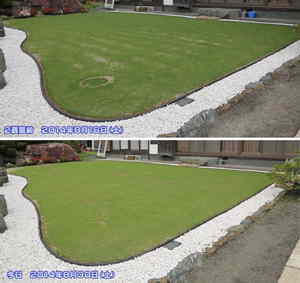・・・・・・・ 2014.08.30(土) ・・・・・・・ 今日は朝から小雨です。 そんな中、7時30分から環境美化のボランティアに参加しました。 農道の草刈りと道路脇に溜まった土の搬出作業、次に市の指定史跡に行く途中の道路脇の枝払い、最後に通学路にはみ出した草を刈りました。 11時前に帰宅して午前中に刈り高設定5.0mmでカットしました。 左の写真は上が2週間前、下が今日の芝刈り後の様子です。 比較すると手前のパッチが大分埋まってきました。 また全体に芝が広がったのが確認できます。 時期は8月下旬の残暑厳しい2週間、そんな気候の中でもここまで回復しています。 ベントグラス【クリスタルブルーリンクス】は暑さに強く、また回復力も強いです。 ところで、今日は補修をメインに全体にベントグラス【A-1】を播種する予定でしたが、小雨&風も強いので延期です・・・・自然には勝てませんから・・・・ |