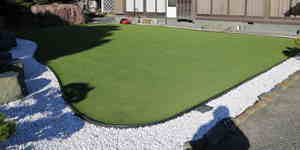 風が冷たかったので手袋をして散布しました。 左の写真は1回目の散布で奥側の半分が終わったところです。 芝生の色が少し変わっています。 |