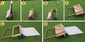@擦込用マット(古いカーペット)と一緒に車庫の隅に立てかけて収納しています。 A側面は赤い線の四角形の板を半分(三角)に切って左右に使っています。 B砂箱(ホッパー)と台車の単純な組み合わせです。 C台車の上に砂箱(ホッパー)を乗せるだけです。 D擦り込み用バージョン。赤丸に@の写真の上に見えるボルトナット3本で合体。 E砂を撒きながら同時に擦り込みを行うバージョン。バックしかできませんが・・・ それではまず台車からご説明します。 F台車は、『砂箱(ホッパー)を乗せる木枠』に取っ手を付けたものになります。 Gこの長方形の木枠に砂箱(ホッパー)が挟まります。 H台車はすべてボルトナット固定です。接着剤や釘は使っていません。 I砂箱(ホッパー)を乗せる木枠の下に空気タイヤが取りつけてあります。 次は砂箱(ホッパー)の説明です。 J側板は35cmの四角形の板を半分(三角)に切っているので底は直角になります。 K横幅は市販の91cmの板で、一枚は隙間を開けてネジで止めてあります。 L散布量調整板(板小)は蝶ネジ固定で砂出し板(板大)が最大3cmまで開きます。 M3cm開いた状態です。通常は5〜10mm程度で散布しています。 この砂箱(ホッパー)には砂が30kg(約20リットル)入ります。 |