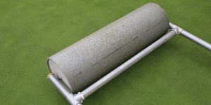 小雨の中で全面をローラー転圧しました。 終わるころにはローラーの塩ビ管が隠れるほど砂が付着しました。 |