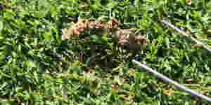 | そして芝の上を来たモグラはここから入ったような気がします。 昨日まで異常がなかったことを考えると穴はまだ狭い範囲、水攻めで行けるような気がします。 と、気がします、気がします、気がしますの連続、いわゆる希望的推測。 |